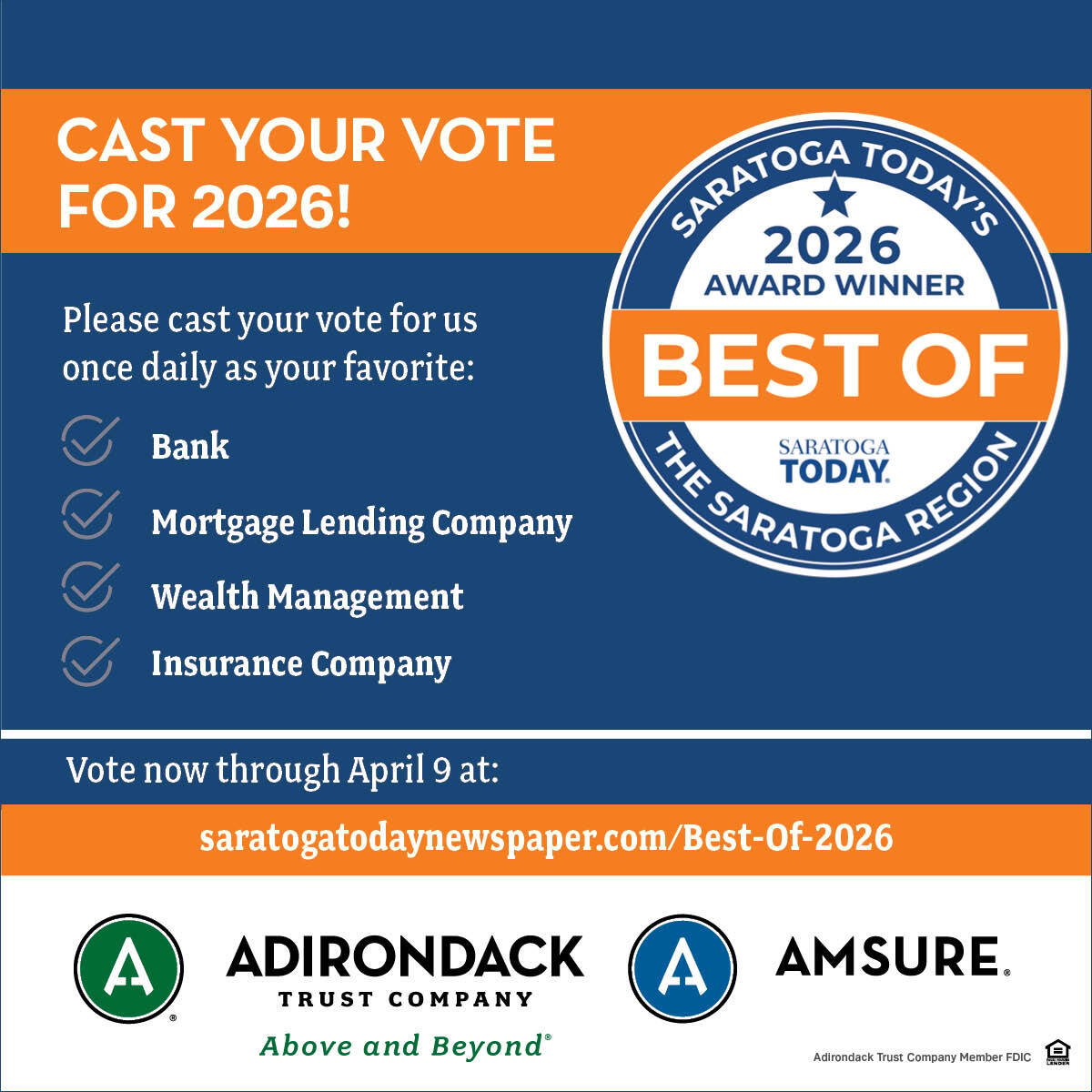 • It is that time of year again—voting is open for the Saratoga TODAY Newspaper 2026 Best of the Saratoga Region Awards! If Adirondack Trust and Amsure have earned your confidence, we would be honored to have your vote